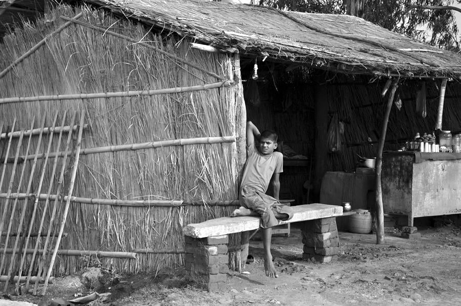 In the heart of a serene and remote Indian village, nestled amidst picturesque fields, stands a humble tea shop crafted from locally sourced straw. Here, a young boy eagerly awaits the return of his father, the shop's proprietor, who has ventured out for his daily lunch break.